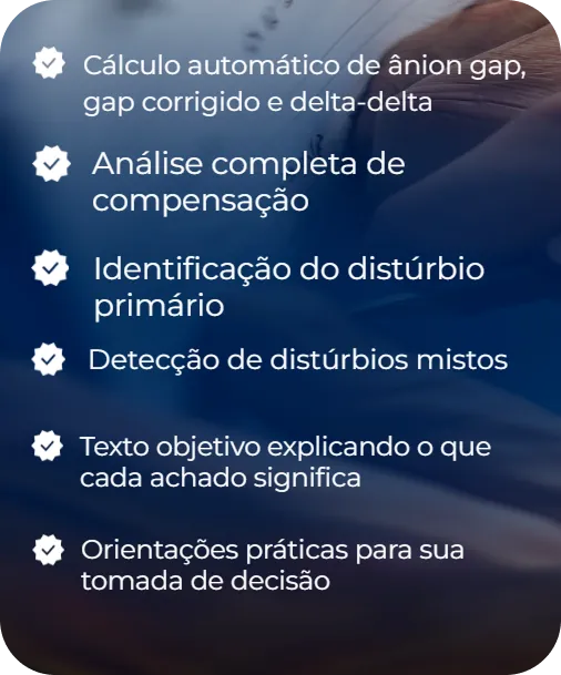 Interprete qualquer gasometria em segundos. Cálculos automáticos, distúrbios identificados